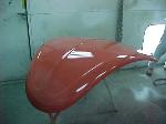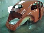 7-12 he applied six coats of sealing wax red and four coats of clear. Photos 13-17 shows the car pushed outside the spray booth to